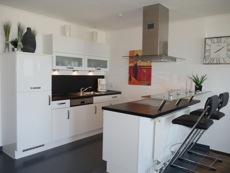 Schlafraum mit regulärem Doppelbett und Wohn-/Schlafraum mit hochwertiger Schlafcouch und schöner Leseecke sowie integrierter Einbauküche ausgestattet mit Geschirrspüler, Mikrowelle, Backofen und Tiefkühlfach. Kabelfernsehen (2. Fernseher im Schlafzimmer), Stereoanlage und DVD-Player sowie Bügeleisen/-brett und Wäscheständer vorhanden. Badezimmer mit Dusche, WC und Fön. Größe der Ferienwohnung ca. 65 qm. Die Ferienwohnung ist komplett mit Fußbodenheizung ausgestattet.