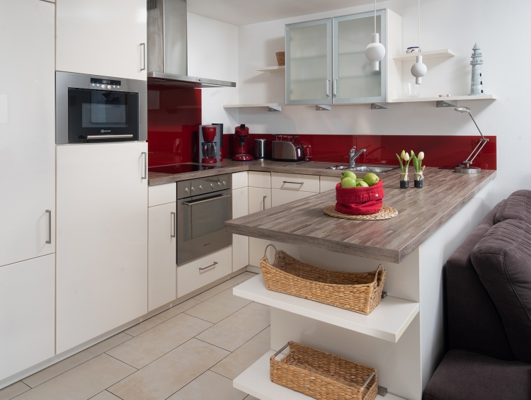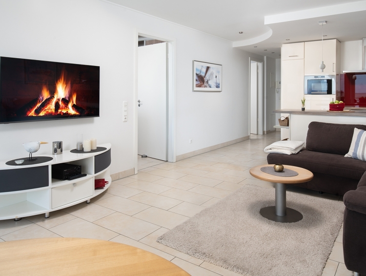 1 Schlafraum mit regulärem Doppelbett, 1 innen liegendes Schlafzimmer mit 2 Einzelbetten und 1 Wohnraum mit integrierter Einbauküche ausgestattet mit Geschirrspüler, Mikrowelle, Backofen und Tiefkühlfach. Kabelfernsehen, Stereoanlage, DVD-Player, Telefon und Internetzugang (WLAN) sowie Bügeleisen/-brett und Wäscheständer vorhanden. Badezimmer mit Dusche, WC und Fön. Größe der Ferienwohnung ca. 63 qm. Insgesamt allergikerfreundliche Ausstattung. Zusätzlicher Abstellraum zur Nutzung auf der gleichen Etage. Fußbodenheizung und zusätzliche Heizkörper in allen Räumen. Parkplatz in der Tiefgarage mit eigener E-Lade-Station (Wallbox) sowie optional zusätzlicher Außenparkplatz in unmittelbarer Nähe.