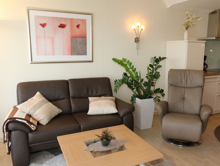 Zwei Schlafräume mit regulären Doppelbetten, davon ein Schlafzimmer mit vollem Meerblick und direktem Balkonzugang, sowie eines innenliegend. Wohnraum mit Relaxsessel und integrierter Einbauküche inkl. Geschirrspüler, Mikrowelle,Backofen, Tiefkühlfach und Kaffeepad-Maschine. Kabelfernsehen, Radio, DVD-Player und Internetzugang (WLAN) vorhanden. Badezimmer mit Dusche, WC und Fön. Größe der Ferienwohnung ca. 65 m². Die Ferienwohnung ist mit elektrischen Außenjalousien und Fliegengittern vor den Balkontüren sowie durchgehend mit Fußbodenheizung ausgestattet. Zusätzliche Heizkörper sind ebenfalls vorhanden. Zur Ferienwohnung gehören ein eigener Abstellraum für Fahrräder sowie ein fester Tiefgaragenstellplatz mit eigener E-Lade-Station (Wallbox). Auf Wunsch steht ein zusätzlicher Außenstellplatz zur Verfügung.