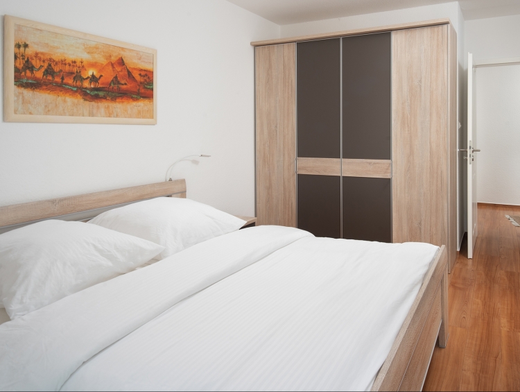 1 Schlafzimmer mit regulärem Doppelbett und SAT-Fernseher und 1 Wohnraum mit Schlafcouch, SAT-Fernseher und integrierter Einbauküche ausgestattet mit Geschirrspüler, Mikrowelle und Backofen. Badezimmer mit Dusche, WC und Föhn.