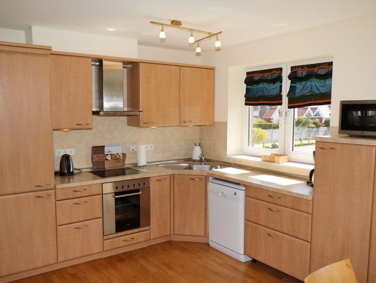 1 Schlafraum mit regulärem Doppelbett, 1 Schlafraum mit 2 Einzelbetten und 1 Wohnraum mit offener Wohnküche ausgestattet mit Geschirrspüler, Mikrowelle, Backofen und Tiefkühlfach. Kabelfernsehen (auch je Schlafzimmer 1 Fernseher), DVD-Player und Stereoanlage sowie Bügeleisen/-brett und Wäscheständer vorhanden. Badezimmer mit Dusche, Badewanne, WC und Fön sowie separates Gäste-WC. Größe der Ferienwohnung ca. 90 qm. Keine Haustiere erlaubt!